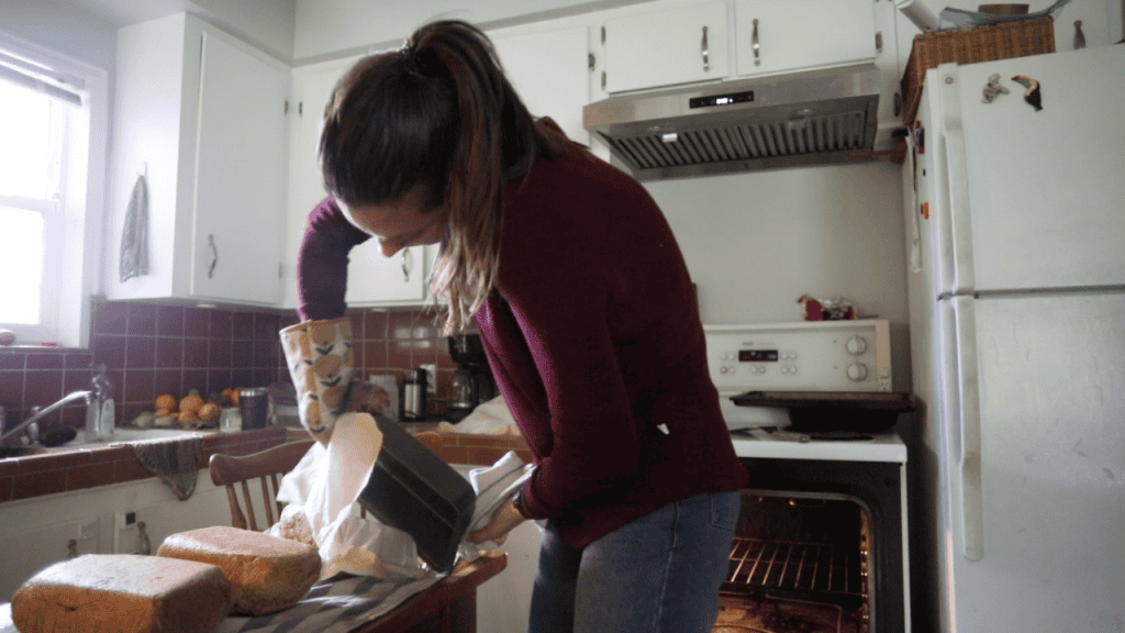 With the tins, I can also put bread pans on top to create an environment for the dough to cook more on the inside, although I got to say I haven’t really noticed that big of a difference if I don’t put the lids on. So maybe this is up for experimentation still and you can see what works best with or without. When I do put those tins on top, I only do it for 30 minutes and then take them off for the last 15 minutes.